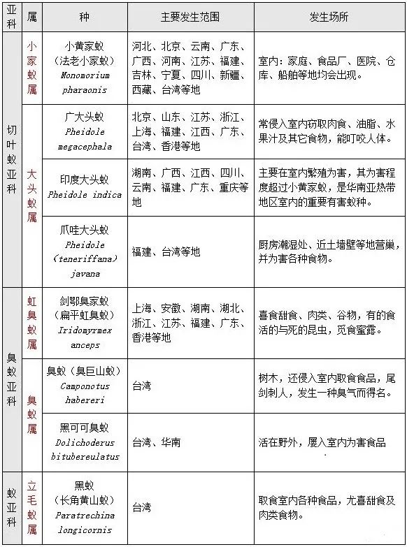常见的蚂蚁种类名称,及其主要发生范围以及发生场所。